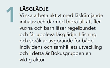 "Med lönsamhet som grund ska Bokusgruppen bidra till ett hållbart och demokratiskt samhälle, där kommande generationer får uppleva läsglädje."